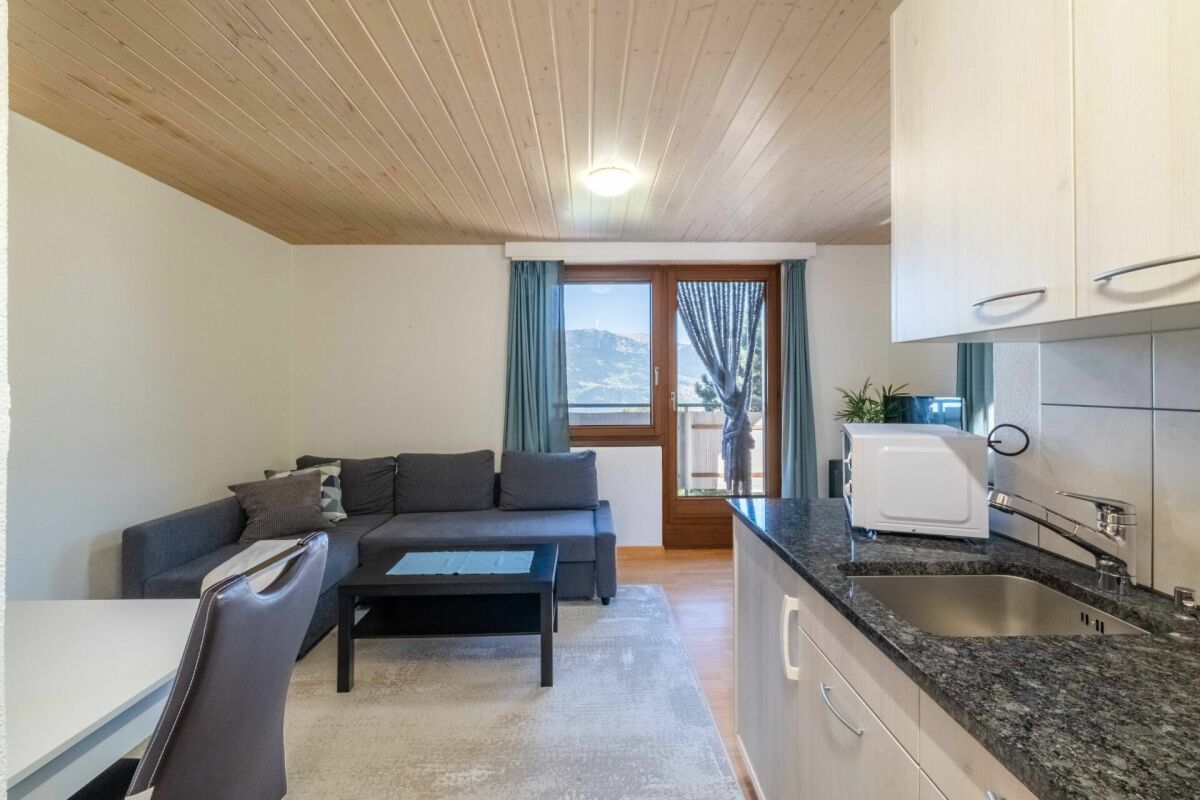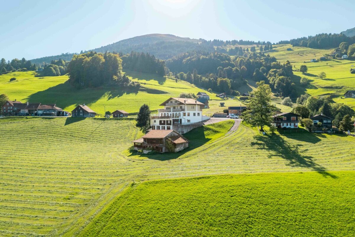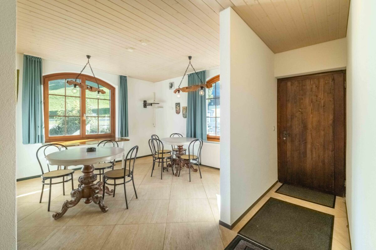 Das Hauptgebäude wurde ehemals als Gastronomiebetrieb mit touristisch genutzten Wohneinheiten geführt. Im Erdgeschoss befindet sich ein voll ausgestattetes Restaurant (ca. 85 m²) mit professioneller Küche (ca. 35 m²). Abgerundet wird das Angebot durch eine grosszügige Sonnenterrasse von rund 84 m², welche in der warmen Jahreszeit ideale Bewirtungsmöglichkeiten bietet. Auf derselben Etage befindet sich zudem ein Studio. Die oberen Stockwerke umfassen zwei 3 ½-Zimmer-Wohnungen sowie eine 2 ½-Zimmer-Wohnung.