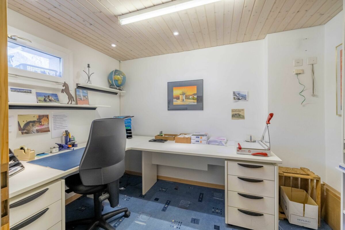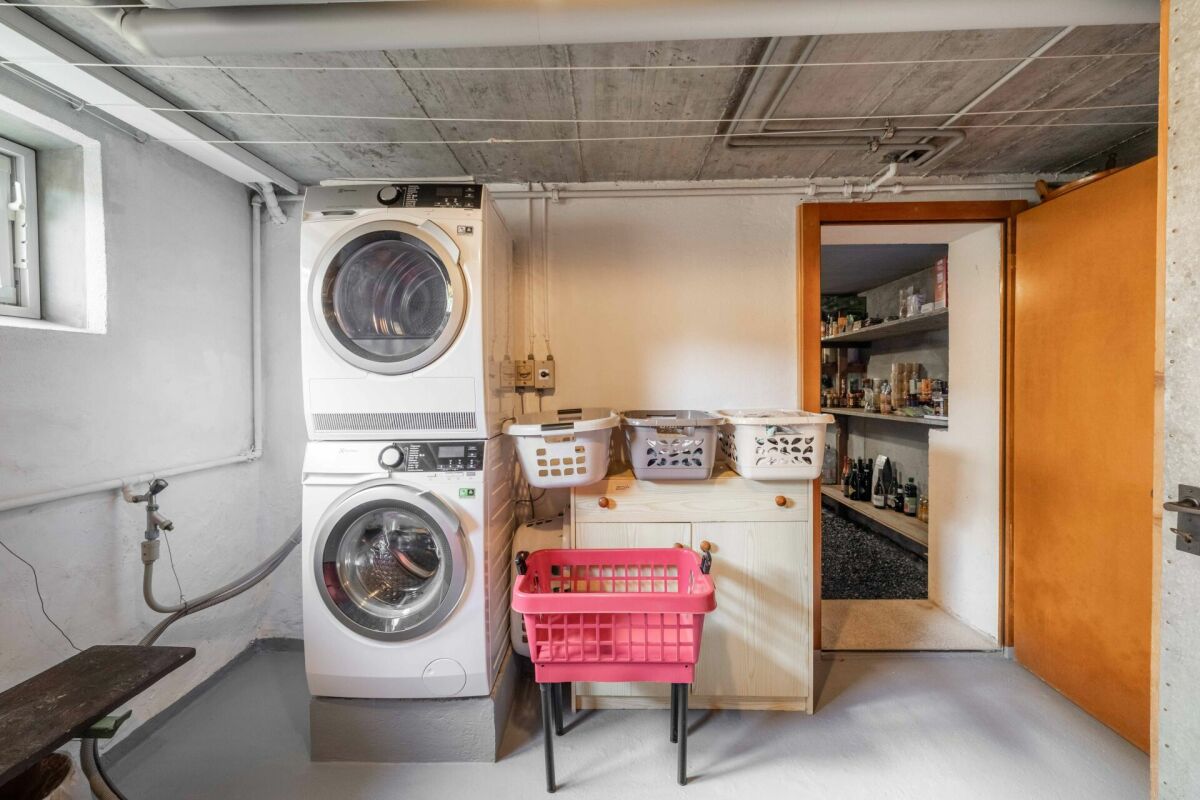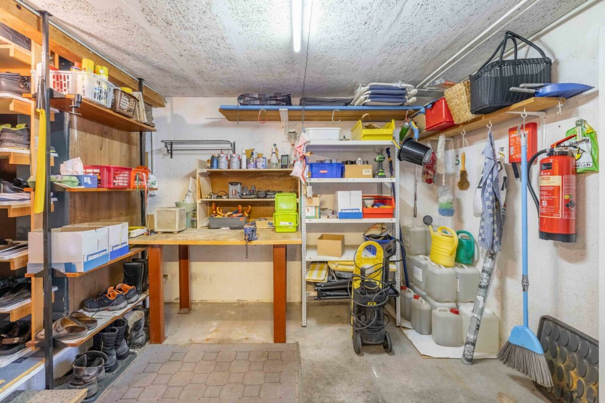 Im Erdgeschoss befinden sich die Garage für zwei Fahrzeuge, die Technikräume, die Waschküche und diverse Kellerräumlichkeiten. Weitere Abstellräume befinden sich hinter dem Haus.