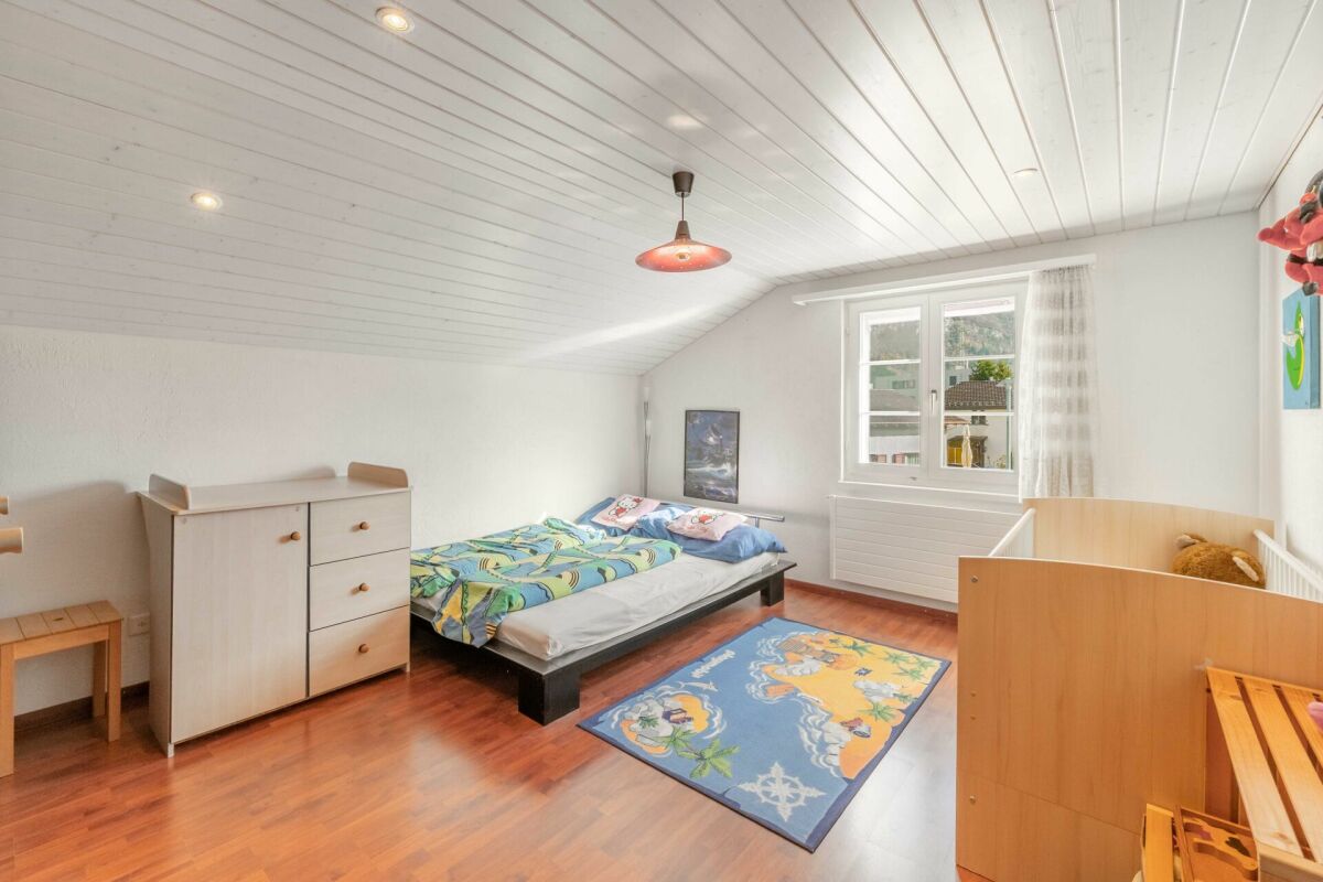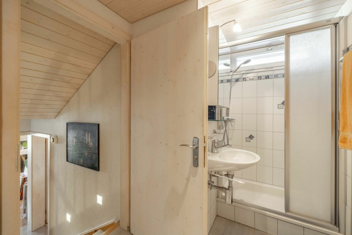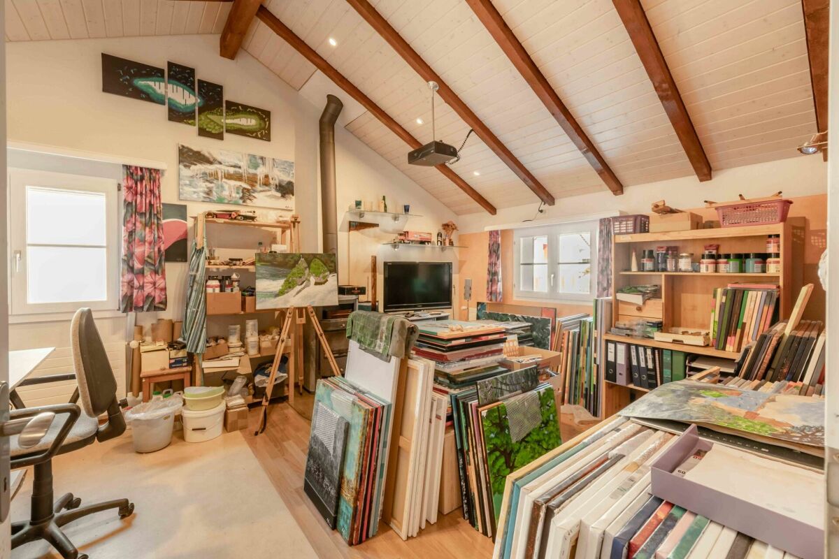 Eine halbe Etage höher befinden sich ein Atelier respektive grosszügiges Zimmer mit gemütlichem Ofen sowie ein zweites Zimmer. Diese Halbetage eignet sich ideal als Rückzugsort oder Arbeitsbereich. Auf der 2. Etage befinden sich weitere Schlafräume sowie ein Badezimmer mit Dusche. Dank der eingebauten Küche könnte dieses Wohngeschoss auch als eigenständige 2½-Zimmer-Wohnung genutzt werden, zum Beispiel für Teenager, die ihren eigenen Wohnbereich geniessen möchten oder auch für Ihre Gäste.