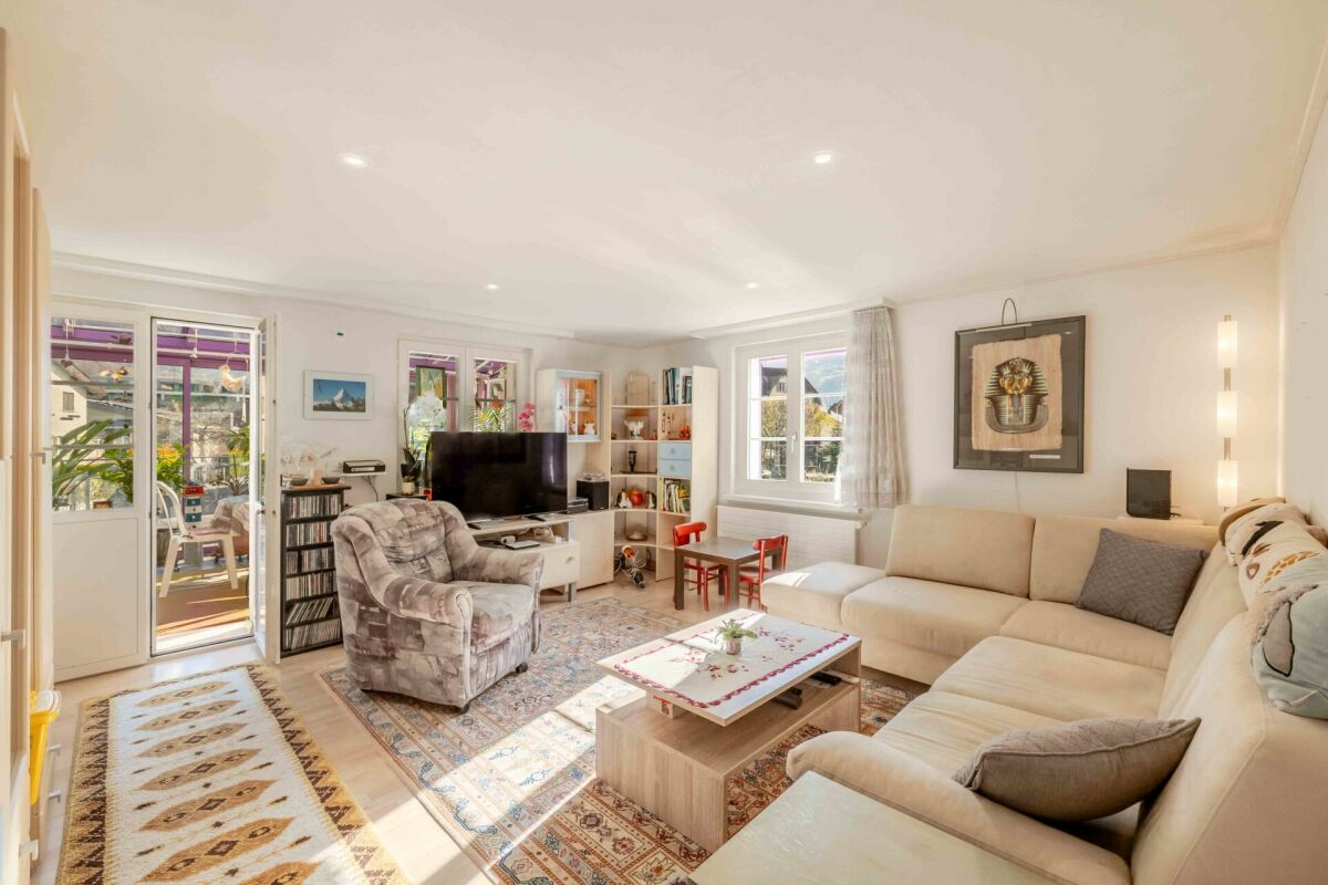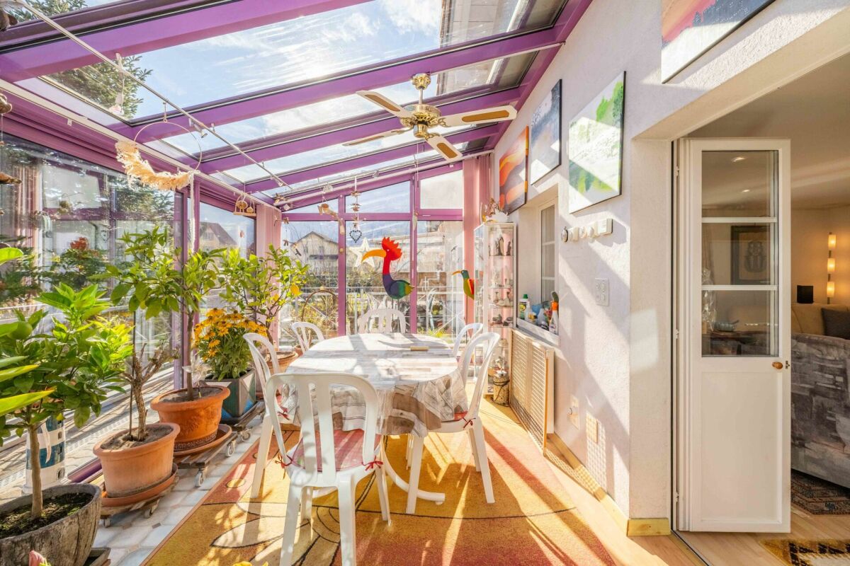 Im 1. Obergeschoss befinden sich der Hauptwohnbereich mit Wohnzimmer, einem Schlafzimmer, Badezimmer mit Badewanne und separater Toilette sowie einer grossen Küche mit integriertem Essbereich. Die Küche wurde im Jahr 2018 komplett erneuert. Ein besonderes Highlight ist die Terrasse mit Wintergarten, die zu jeder Jahreszeit zum Entspannen und Geniessen einlädt. Zusätzlich steht ein Aussenbereich zur Verfügung, falls Sie direkte Sonne auf dem Balkon wünschen.