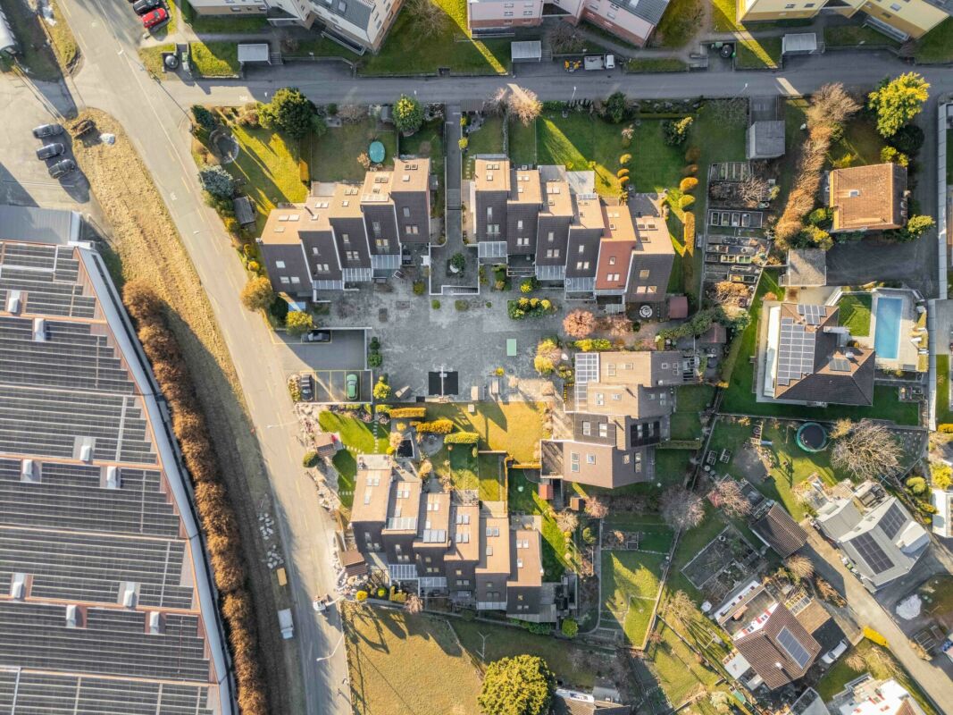 Der grosszügige Wohnbereich und die praktische Küche im Erdgeschoss bilden das Herzstück des Hauses und laden zum gemütlichen Verweilen ein. Beide Räume verfügen jeweils über einen direkten Zugang zum Garten resp. auf teilweise überdachte Sitzplätze, wodurch Innen- und Aussenbereich optimal miteinander verschmelzen. Die beiden Sitzplätze geniessen Sonne vom Morgen bis zum Abend, und der Küchensitzplatz öffnet sich zu einem grosszügigen Gemeinschaftsbereich mit Kinderspielplatz. Ein komfortables Gäste-WC rundet das Raumangebot auf dieser Etage ab.